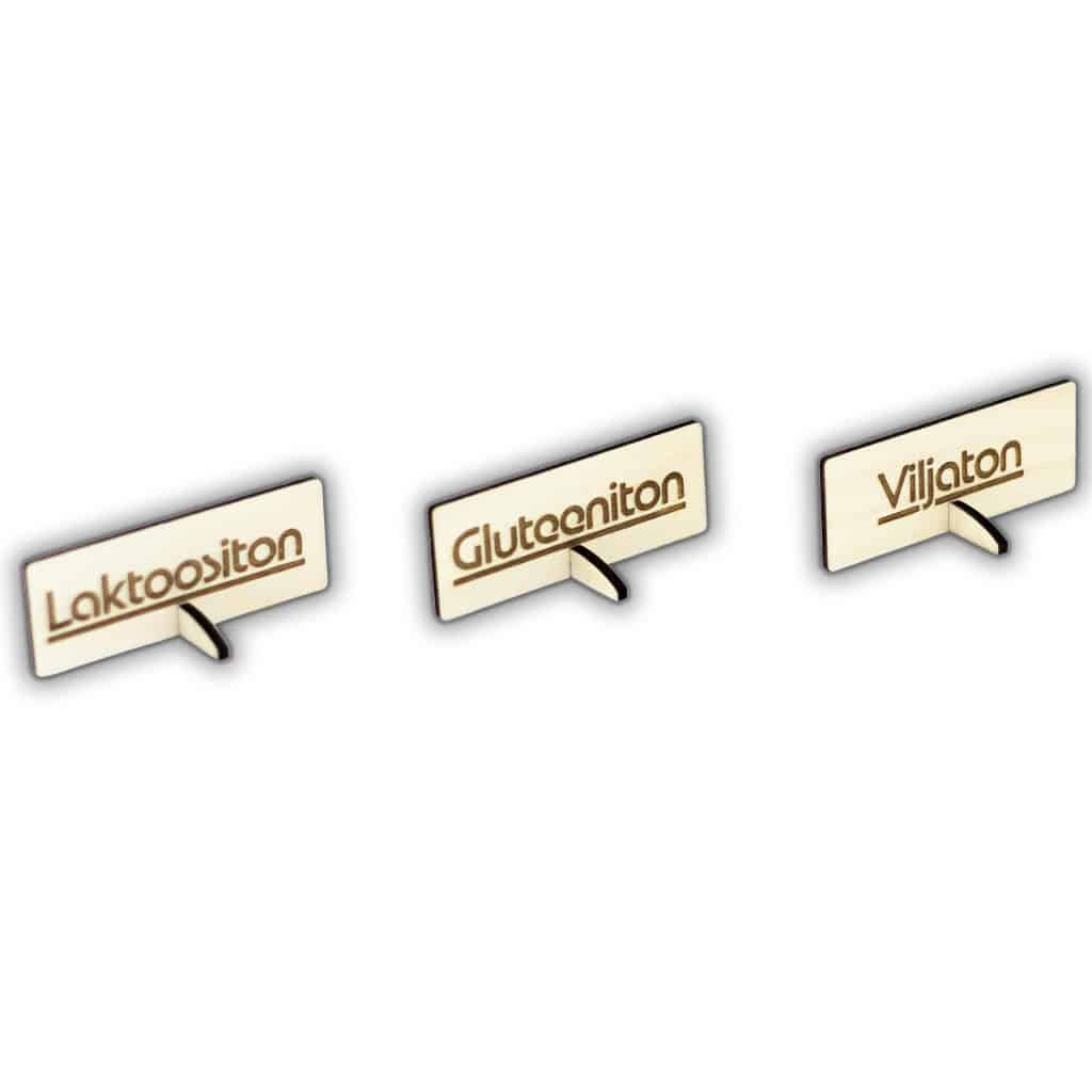 – “Laktoositon”, “Kasvis”, “Vegaaninen”, “Maidoton”, “Munaton”, “Gluteeniton”, “Sokeriton”, “Viljaton”