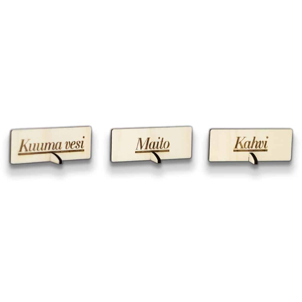 – “Kahvi”, “Tee”, “Kuuma Vesi”, “Maito”, “Kauramaito”, “Kerma”